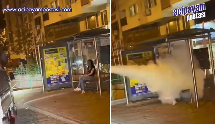 Bursa'da yaşanan olayda, bir aracın kasasındaki kişi, otobüs durağında oturan kadının üzerine yangın tüpü sıktı.