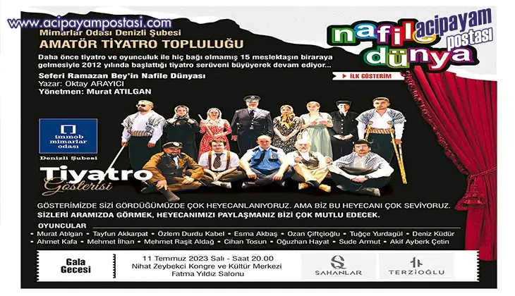 Mimarlar Odası Denizli Şubesi tarafından kurulan amatör tiyatro topluluğu, sanatseverleri yeni bir oyunla buluşturmaya hazırlanıyor. Daha önce tiyatro ve oyunculuk ile hiç bağı olmamış 15 meslektaşın bir araya gelmesiyle 11 yıl önce başlattığı tiyatro serüveni büyüterek devam eden Mimarlar Odası Denizli Şubesi amatör tiyatro topluluğu Oktay Arayıcı’nın yazdığı Murat Atılgan’ın yönettiği ‘Seferi Ramazan Bey’in Nafile Dünyası’ oyununu sahneleyecek. 11 Temmuz Salı akşamı saat 20.00’de Nihat Zeybekçi Kongre ve Kültür Merkezi Fatma Yıldız Salonu’nda sahnelenecek oyunda Murat Atılgan, Tayfun Akkarpat, Özlem Kabel, Esma Akbaş, Ozan Çiftçioğlu, Tuğçe Yurdagül, Deniz Küdür, Ahmet Kafa, Mehmet İlhan, Mehmet Aldağ, Cihan Tosun, Oğuzhan Hayat, Sude Armut ve Akif Çetin rol alacak.