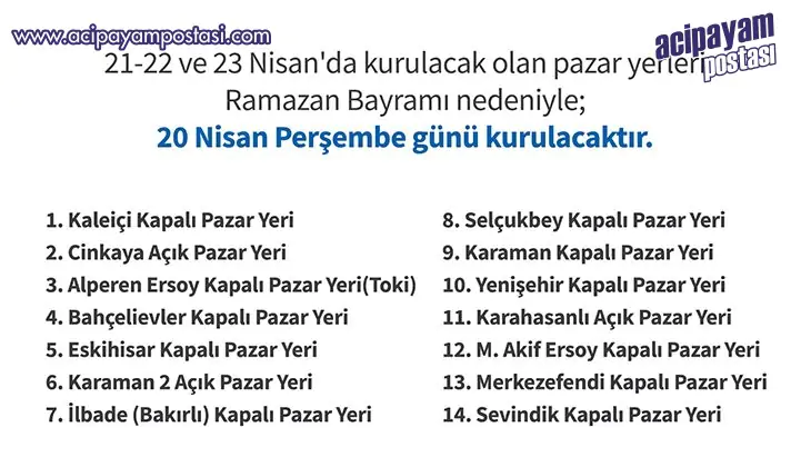 20 Nisan Perşembe günü; Kaleiçi Kapalı Pazar Yeri, Cinkaya Açık Pazar Yeri, Alperen Ersoy Kapalı Pazar Yeri(TOKİ), Bahçelievler Kapalı Pazar Yeri, Eskihisar Kapalı Pazar Yeri, Karaman 2 Açık Pazar Yeri, İlbade (Bakırlı) Kapalı Pazar Yeri, Selçukbey Kapalı Pazar Yeri, Karaman Kapalı Pazar Yeri, Yenişehir Kapalı Pazar Yeri, Karahasanlı Açık Pazar Yeri, Mehmet Akif Ersoy Kapalı Pazar Yeri, Merkezefendi Kapalı Pazar Yeri ve Sevindik Kapalı Pazar Yeri hizmet verecek.