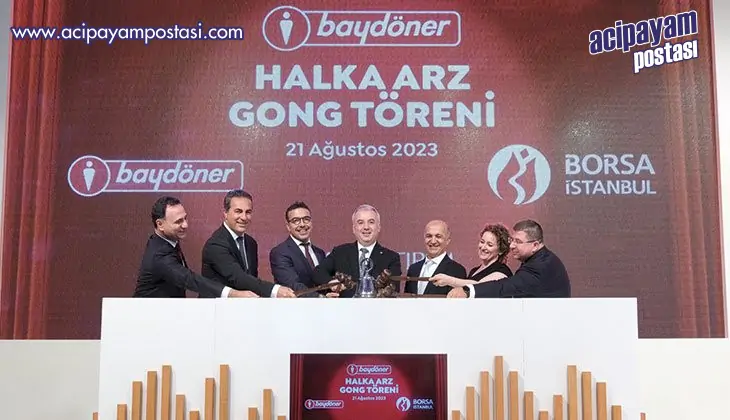 Türkiye'nin döner restoran zincirlerinden olan Baydöner, halka arz sürecini başarıyla tamamladı. Şirkete nominal halka arz büyüklüğü olan 18 milyon TL’nin 3,23 katına denk gelen filtrelenmemiş 58 milyon 129 bin 393 TL nominal değerli talep geldi. Baydöner, gerçekleştirilen gong töreninin ardından Borsa İstanbul’da BYDNR koduyla işlem görmeye başladı.