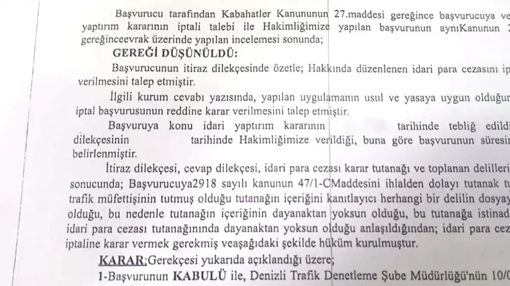 Denizli’de daha öncede ev almak için kredi çeken ve evine sigorta yaptıran S.K isimli vatandaş, kombisine bakım yaptırmayan sigorta şirketini mahkemeye vermişti. Açtığı davayı kazanıp sigorta poliçesine ödediği parayı mahkeme kararıyla geri alan S.K’nin aracına fahri trafik müfettişi tarafından ‘Trafik işaret levhalarına uymamak ’tan 993 TL para cezası kesildi. Yaklaşık 10 gün sonra fahri trafik müfettişinin kestiği cezanın makbuzu S.K’nin eline ulaştı. S.K. gelen cezanın iptali için UYAP üzerinden mahkemeye başvurdu. Sulh ceza mahkemesi fahri trafik müfettişinin kestiği cezanın iptaliyle ilgili dilekçeyi usulüne uygun diyerek kabul etti. S.K dilekçesinde kesilen ceza ile ilgili olarak fotoğraf ve video gibi somut bir delilin dilekçeye eklenmesini istedi. Ancak Fahri Trafik Müfettişi kestiği cezayı kanıtlayamadı ve Emniyet Müdürlüğünden gelen yazı da somut delil mahkemeye sunulamadı. Fotoğraf ve video kaydı gelmediği için mahkeme S.K’ ye fahri trafik müfettişi tarafından kesilen 993 TL’lik cezanın iptaline karar verdi. Mahkeme giderlerinin de kamuya bırakılmasına karar verdi. S.K. buna da tepki göstererek, ‘Ben kendimden emindim. Trafik kurallarına harfiyen uyarım. Fahri trafik müfettişi en basit suçtan bana trafik cezası yazmış. Elime ceza tutanağı gelince çok şaşırdım. Bu cezayı kabul etmedim. Cezanın iptali içinde mahkemeye başvurdum. Mahkeme işlediğim iddia edilen suçla ilgili fotoğraf ve video kaydı olmaması nedeniyle cezayı iptal etti. Bu mahkemenin masrafları da kamuya kaldı. Bence bu cezayı yazan müfettiş mahkemeyi kaybettiğinde mahkeme masraflarını da ödemeli. Nasıl ki ben davayı kaybetseydim bu masrafları ödeyecektim. Fahri müfettişlerde ödemeli’ dedi
