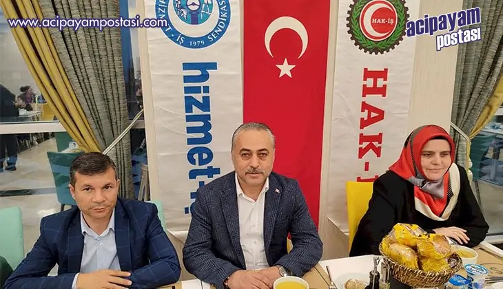İftar yemeğinde DESKİ Genel Müdürlüğü'nde görevli iken emekliye ayrılan sendika temsilcileri Niyazi Taşbaş ve Yüksel Altıntaş’a da plaket ve çeşitli hediyeleri verildi. Sendika olarak deprem bölgesine de büyük miktarlarda yardım malzemesi gönderdiklerini hatırlatan HAK-İŞ Denizli İl Temsilcisi ve Hizmet-İş Denizli Şube Başkanı Sezai Söylemez, “Mübarek Ramazan Ayının son haftasına yaklaştık. Hizmet İş Denizli şubesi olarak yönetim kurulumuz, komite başkanlarımız, Denizli Büyükşehir, DESKİ; Pamukkale Belediyesi sendika temsilcilerimizle birlikte, Devlet Su İşleri (DSİ) misafirhanesinde kalan depremzede kardeşlerimizle ve ailelerimizle birlikte Ramazan Ayının paylaşım, kardeşlik kültürümüzü yaşatma anlamında onlarla birlikte iftar yaptık. Rabbim yaklaşmakta olan Ramazan bayramımızı Kadir Gecemizi mübarek eylesin. Kardeşliğimizi, birliğimizi daim eylesin. Şimdiden herkesin bayramı mübarek olsun” dedi.