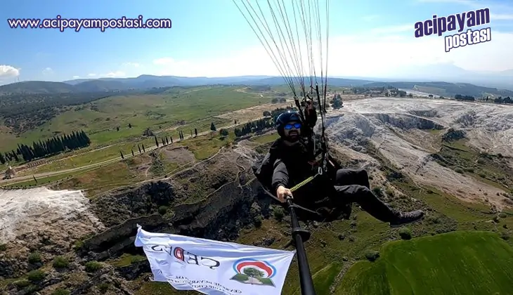 Türkiye’nin en önemli doğal kaynaklarında, doğal güzelliklerinden biri olan Pamukkale semalarında yamaç paraşütçüleri şöleni vardı. Milli Eğitim Bakanlığı, Gençlik ve Spor Bakanlığı ve Diyanet İşleri Başkanlığı tarafından hayata geçirilen projenin tanıtımı için uçan pilotlar görsel şölen yarattı. ÇEDES Projesi Merkezefendi İlçe koordinatörü Bünyamin Şahban, “Bu sene tüm Türkiye'deki okulların yürüteceği ÇEDES projesi, deprem bölgesindeki okullar ile Türkiye'nin diğer illerindeki okulların kardeş okul olarak belirlenmesinin ardından ilk etapta merhamet ve yardımseverlik kök değerlerinin okullarda değerler kulübü kurularak işlenmesiyle devam edecek. ÇEDES projesi kapsamında kardeş okullarla iletişim kurularak, maddi veya manevi yardım, sportif turnuvalardan kitap okuma etkinliklerine, ziyaret ve gezilerden geleneksel oyunlara öğrencilere kadim değerlerimizin kazandırılması için çok yönlü etkinliklerin hayata geçirilmesi planlanıyor. ÇEDES Projesi Merkezefendi İlçe koordinatörü olarak bende projenin tanıtımını Pamukkale travertenleri üzerinde yamaç paraşütümden açtığım proje bayrağıyla yapmak istedim” dedi.