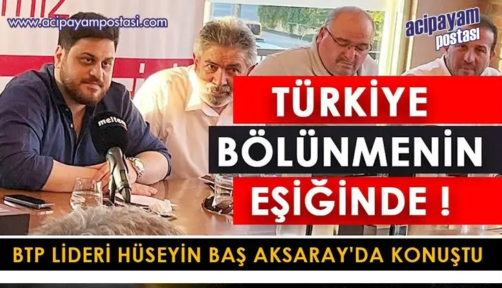 Aksaray’da konuşan BTP Genel Başkanı Hüseyin Baş, “Türkiye bölünmenin, parçalanmanın, kavganın, savaşın her türlü musibetin eşiğinde bir durumda” dedi.